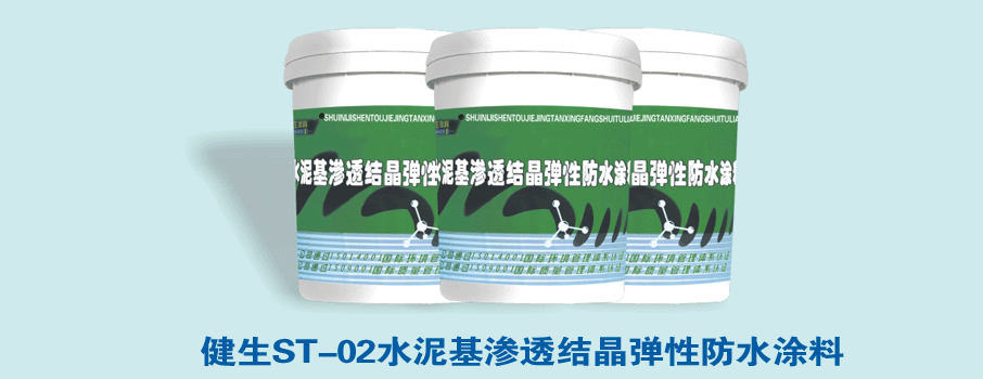健生ST一02水泥基渗透结晶弹性防水涂料是引进国外尖端技术、以特殊配方研制生产 的、由无机粉料和有机液料复合而成的双组份渗透结晶型防水材料。它具备有机材料高韧高弹和无机材料高强耐老化等优点,涂刷后可形成高强坚韧的防水涂膜。产 品指标执行国家行业标准:JC/T894—2001。