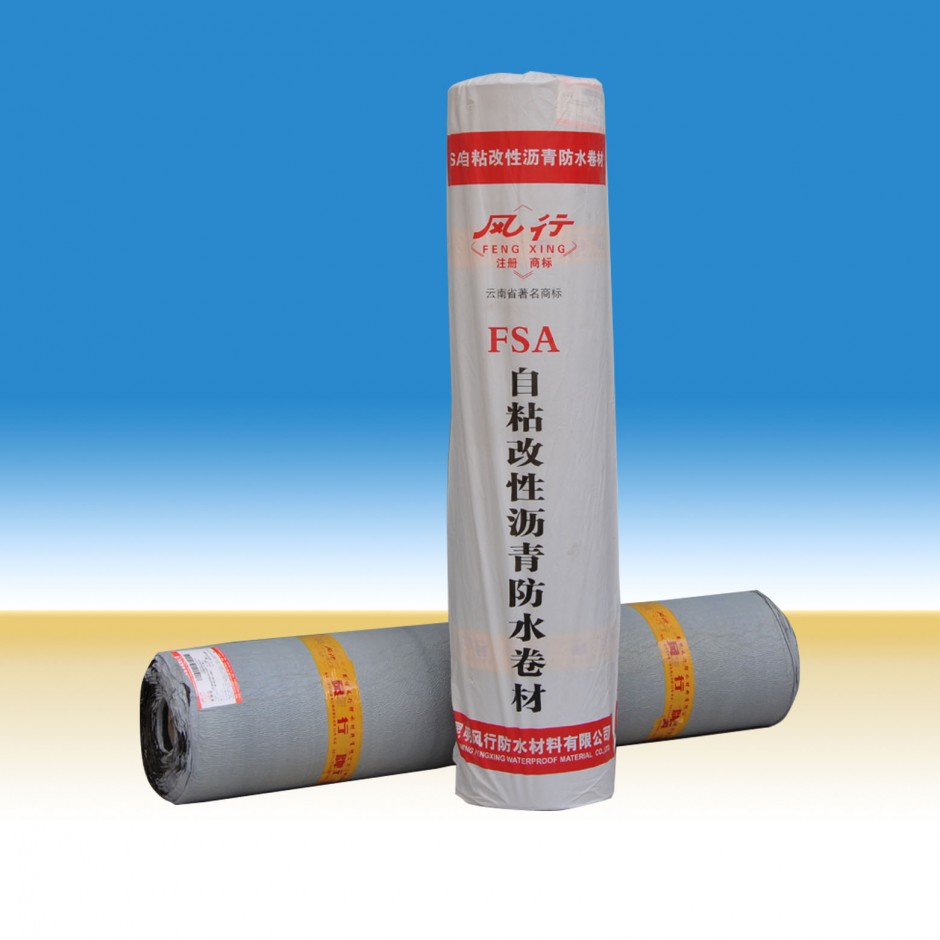 风行牌FSA自粘改性沥青防水卷材是以粘性较强的的特殊聚合物改性沥青为基料,加入优质的增塑剂、增粘剂、抗老剂,采用特殊加工工艺,以聚酯毡为胎体,以高密度聚乙烯膜(PE)、铝箔、矿物砂或隔离膜作为上表面材料,可剥离的涂硅隔离纸(膜)为下表面防粘隔离材料制成的自粘防水卷材。